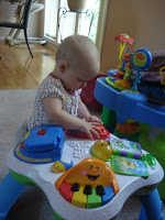 In the last week I have learned how to crawl on all fours - a real crawl! And since I can do that I can get into whatever I want..today I chose my toybox in the living room..Mama says that was a good choice! After I played in there for a bit I decided I would crawl to my learning table and with Mama's help standing I can hold myself up and play at the table now!!